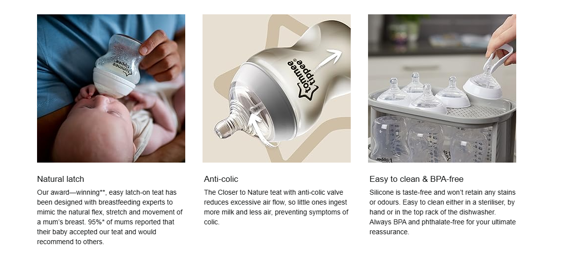 - خالية من مادة BPA: حلمات زجاجات الأطفال من Tommee Tippee خالية دائمًا من مادة BPA والفثالات لضمان أقصى درجات الطمأنينة