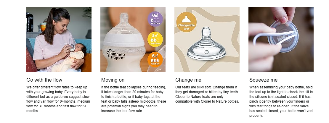 - معدلات تدفق مختلفة: حلمات زجاجات Closer to Nature متوفرة في مجموعة متنوعة من معدلات التدفق المختلفة لمواكبة نمو طفلك: تدفق سريع، تدفق متوسط، تدفق بطيء، وتدفق متغير.