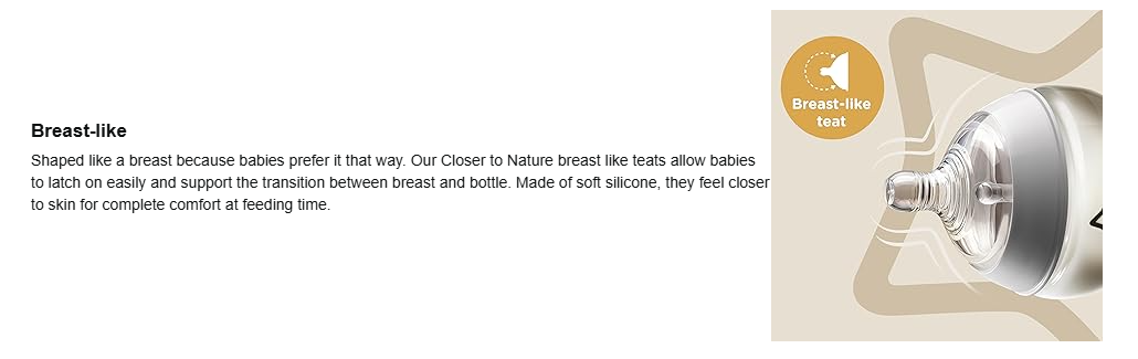 - إن حلمة الرضاعة الطبيعية التي تشبه الثدي والتي تحظى بشعبية كبيرة بين الأمهات والأطفال، والتي تتميز بسهولة الالتصاق بها، تشبه الجلد وتحاكي المرونة الطبيعية وحركة ثدي الأم من أجل رضاعة مريحة.