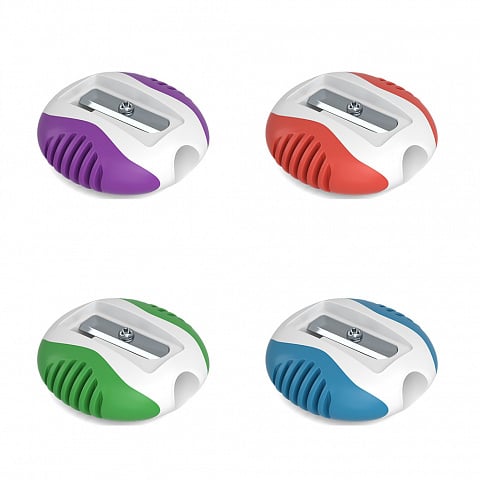 - A plastic pencil sharpener in the plastic housing with colored anti-slip rubber edges.