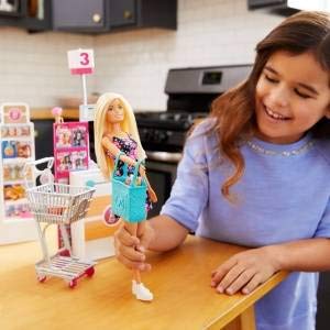 - Take Barbie doll on a run to the grocery store with this supermarket playset that has all of the ingredients for fun, more than 25 pieces total: Barbie doll comes with a checkout stand with register and working conveyor belt, display stand, rolling shopping cart and food accessories to stock the shelves