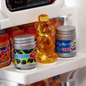 The display case can be fully stocked with multiple sides to encourage play from all angles. There's a working drawer for produce and a hanging scale to play out weighing tasty looking fruits, like green or red apples. Other popular items include milk, eggs, cereal, yogurt, tomato sauce, spaghetti, a honey bear jar, juice, water, laundry detergent, paper towels, soap and even a bouquet of flowers.