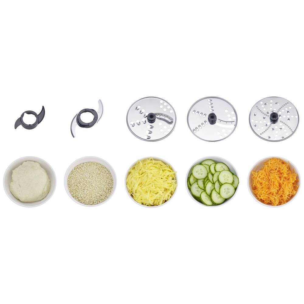 - 1.5 l stand mixer attachment made of glass / 1.5 l working container with lid attachment / Stainless steel knife / 2-in-1 disc: for coarse rasping/Julienne / 2-in-1 slice: for medium rasp/slice cutting / 2-in-1 slice: